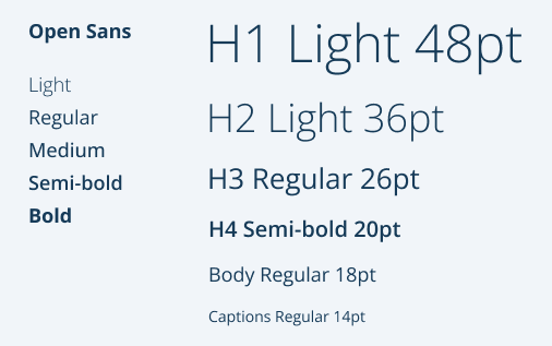 For type, I opted for Open sans, which is a professional and legible typeface that has many different weights to offer, and looks good as both larger point-sized headings and smaller body text/captions.