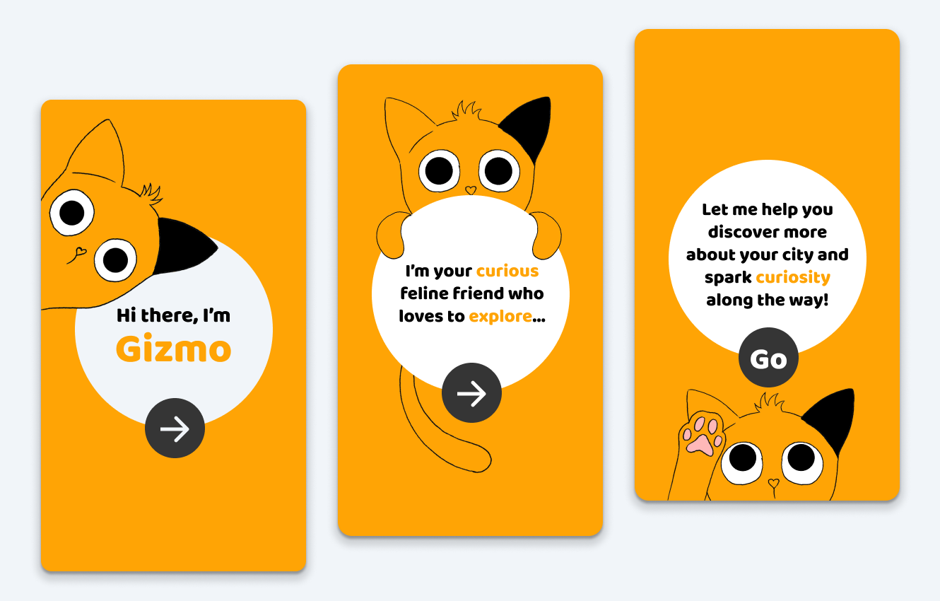 The main character of this project is Gizmo the "curious cat," who embodies the curious spirit that I'm aiming to instill in users. The goal is to encourage users to take
