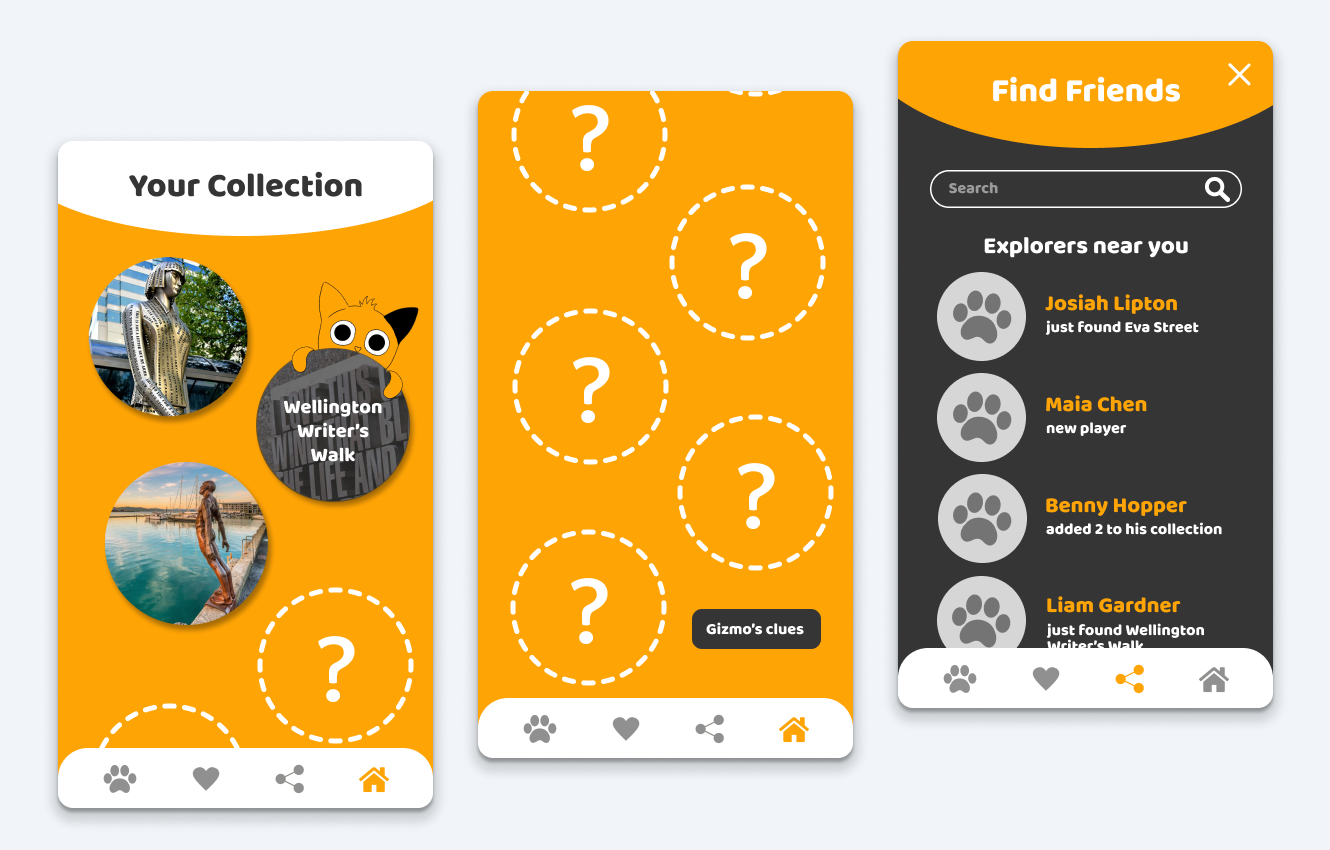 The user journey begins in the physical world before it enters the digital world. Users will find coin-sized "Gizmo tokens" throughout their city — this interaction is inspired by the familiar experience of spontaneously discovering a coin on the pavement — I'm sure this is something we've all experienced (as both children and adults), and it's something which sparks a momentary excitement or surprise in us.